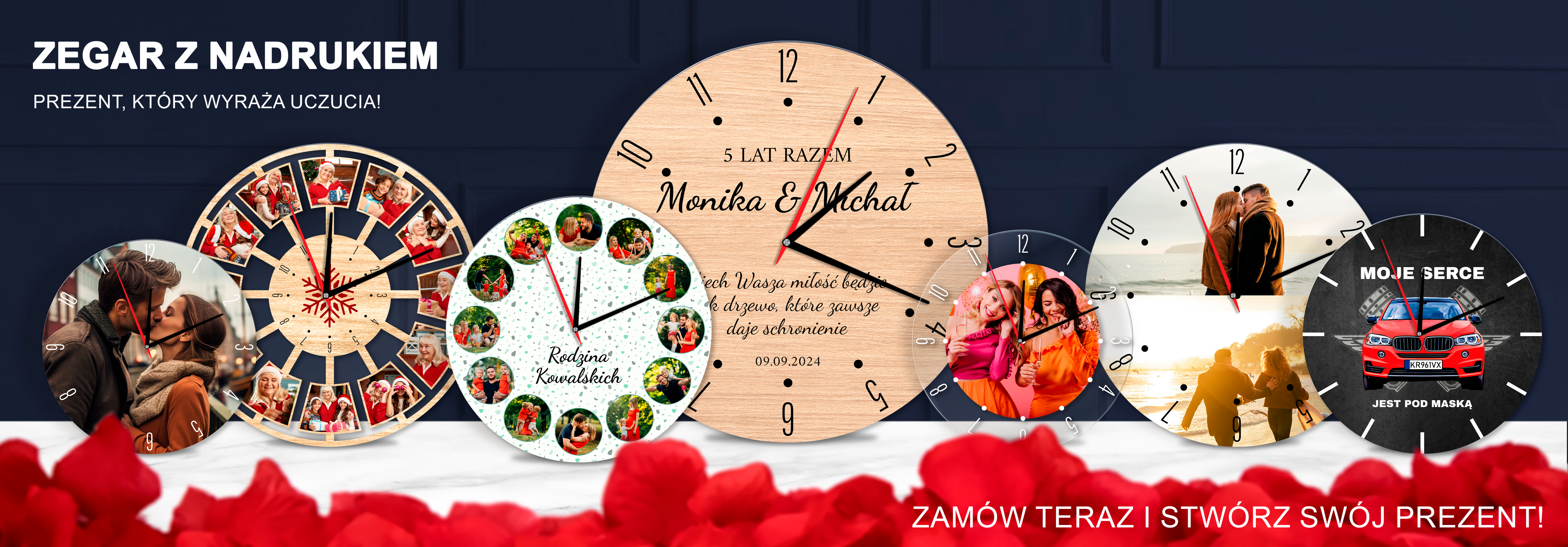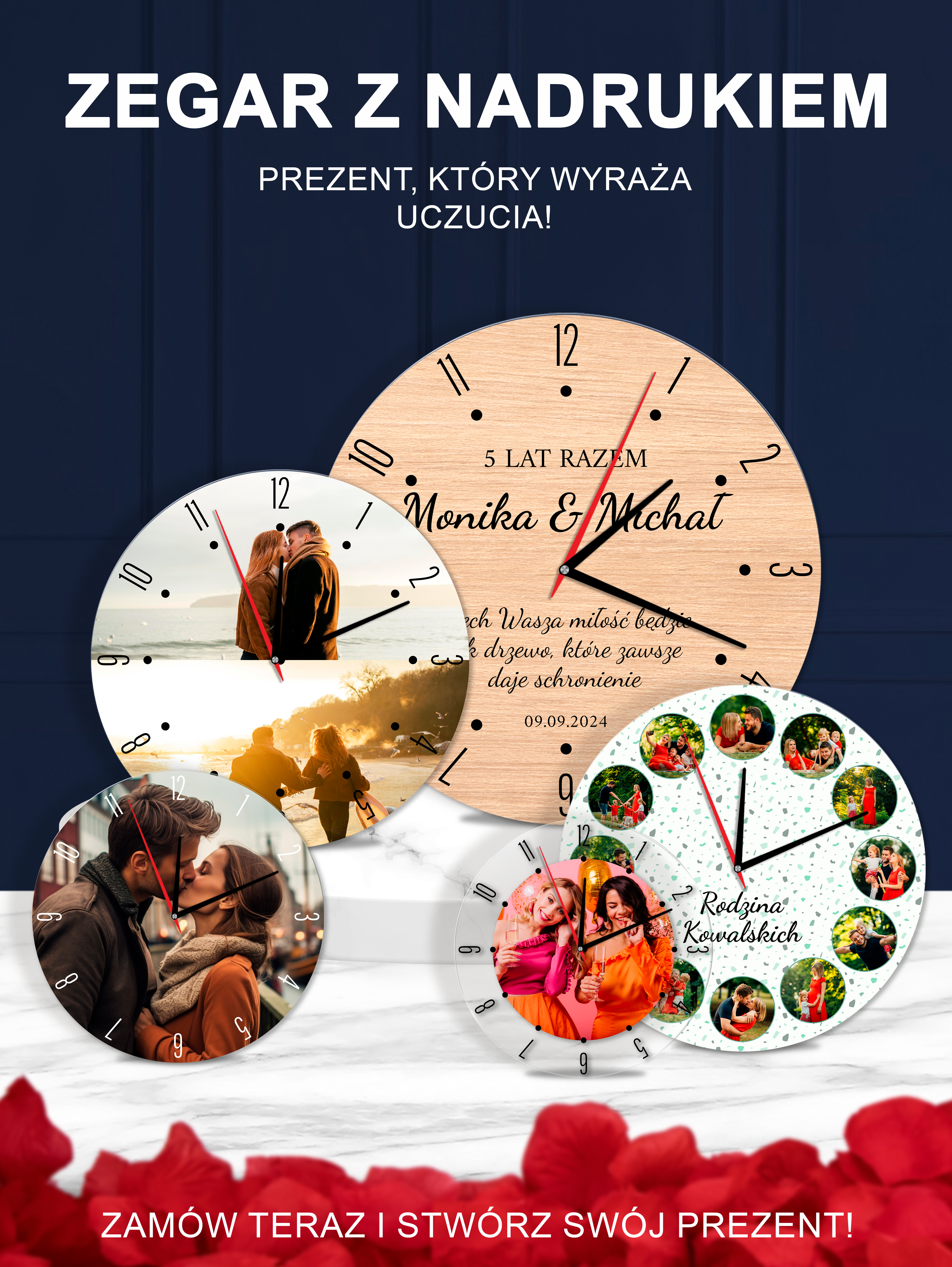 Czas to jeden z najcenniejszych darów, jakie możemy ofiarować bliskim. Podaruj im nie tylko wspólne chwile, ale także wyjątkowy zegar, który każdego dnia będzie przypominał o pięknych wspomnieniach. Personalizowany zegar z nadrukiem to doskonały pomysł na prezent – funkcjonalny, elegancki i jednocześnie pełen emocji. Niezależnie od okazji, taki upominek pozwoli wyrazić uczucia w wyjątkowy sposób. Stwórz własny projekt i spraw, by każda minuta była wyjątkowa!