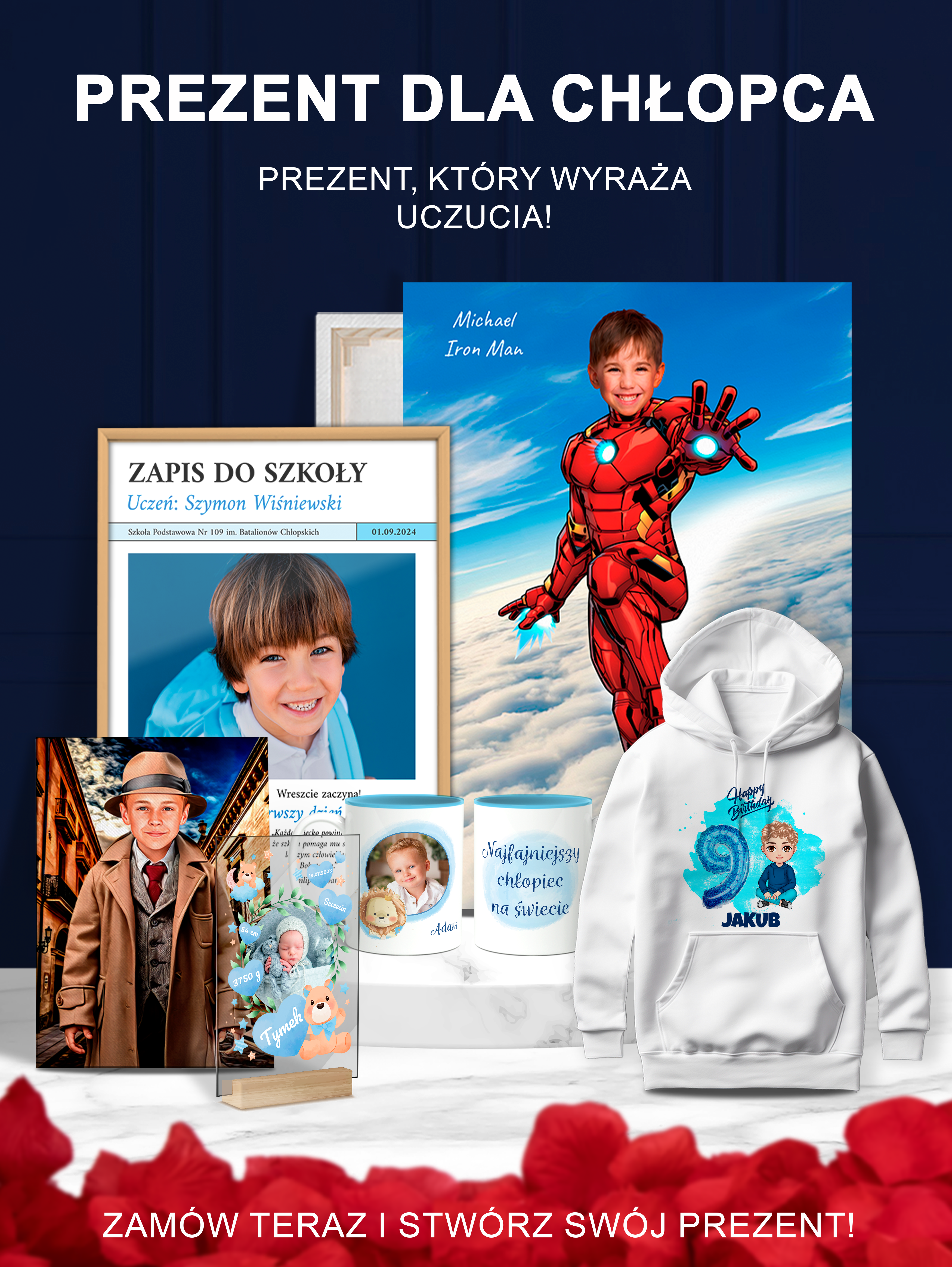 Dzień Dziecka to niezwykle ważne święto dla każdego chłpca i dziewczynki. Wszystkie dzieci z niecierpliwością czekają na 1 czerwca. Tą szczególną okazję należy uczcić podarowując smykom gadżety i zabawki. Nawet niewielki upominek, będzie miłym gestem, który wywoła uśmiesz na twarzy smyka. Jeśli chłopiec jest fanem gier dobrym pomysłem okazać może się mini konsola pac-man, kubek gracza lub breloczek do kluczy z motywem z ulubionej gry. Jeżeli chłopiec, którego planujemy obdarować preferuje spędzanie czasu na świeżym powietrzu. Prezenty sportowe mogą sprawić mu najwięcej radości. Warto wcześniej dowiedzieć się, jaki sport lubi najbardziej. Posiadając już tą wiedzę wybór prezentu dla chłopca będzie łatwiejszy. A może przyszło Ci znaleźć prezent dla małego konstruktora? Jeśli tak, to dobrym pomysłem mogą okazać się zestawy kreatywne dla chłopca. Za ich pomocą urwis będzie mógł zbudować to, co przyjdzie mu do głowy. Tego rodzaju prezent dla małego budowniczego okaże się prawdziwą gratką i umożliwi rozwijanie wyobraźni dziecka poprzez zabawkę. Z okazji Dnia Dziecka popularne prezenty dla chłopca, takie jak samochodziki, czy figurki mogą okazać się nieco nudnym upominkiem. W końcu tego rodzju podarunki dzieci dostają często i nie jest to nic szczególnego. W Dzień Dziecka prezent dla chłopca powinien być przede wszystkim oryginalny i zaskakujący. Pierwszego czerwca obchodzimy święto wszystkich dzieci, w tym również nastolatków. Wydawać się może, że znalezienie podarunku dla nastoletniego chłopca to zadanie niemal niemożliwe. W końcu nastolatkowie są zmienni i trudno podarować coś wpasowującego się w ich gust. Młodzi ludzie często mają swoje ulubione filmy, czy seriale. Wysokiej jakości odzież z nadrukiem uwielbianej postaci na pewno stanie się trafionym podarunkiem. Taki licencjonowany produkt dla chłopca będzie czymś wyjątkowym i z pewnością doceni Twój wysiłek, który włożyłeś podczas poszukiwań odpowiedniego podarunku. Prezenty dla chłopca związane z grami, czy lubianymi filmami zawsze będą dobrym wyborem, bez względu na okazję. Jednak gust z wiekiem się zmienia i wręczony przez nas upominek może za jakiś czas nie być odpowiedni dla chłopca. Z tego względu lepiej będzie zdecydować się na prezent, który nie ,,zestarzeje się'' w ten sposób. Spersonalizowany druk na płótnie to idealna propozycja na Dzień Dziecka, jak i prezent urodzinowy dla chłopca. Wybrane przez Ciebie zdjęce wydrukowane zostanie na wysokiej jakości płótnie tworząc w ten sposób idealny prezent dla 6-latka, 10-latka, czy młodego mężczyzny. Gotowy wydruk świetnie sprawdzi się jako oryginalna dekoracja pokoju dziecka. Duża fotografia przedstawiająca chłopca na pewno przypadnie chłopcu do gustu. W Adamell przygotowaliśmy różne formaty płótna, abyś mółgł wybrać ten najbardziej pasujący. Na naszej stronie internetowej znajdź wyjątkowy prezent dla chłopca z okazji Dnia Dziecka lub innych okazji!