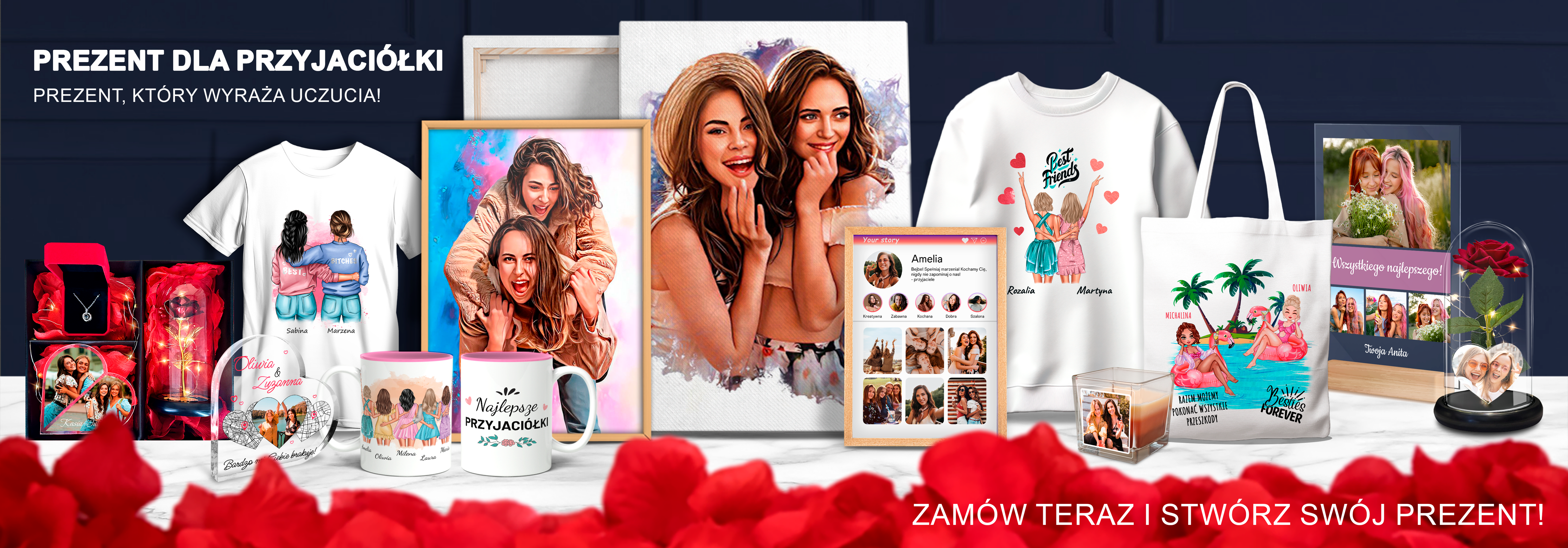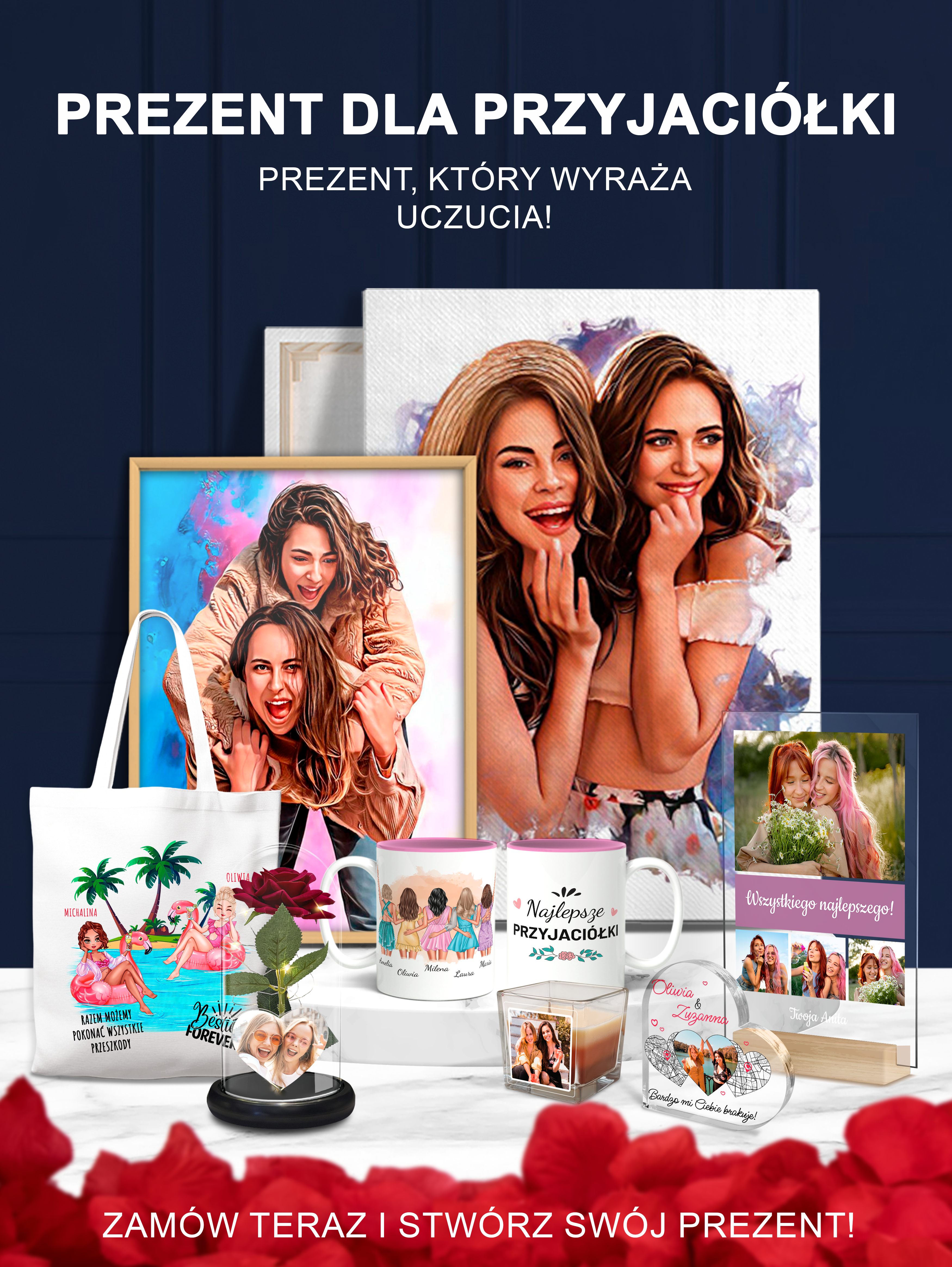 Bliska przyjaciółka często uważana jest za członka naszej rodziny. Można jej powierzyć każdą tajemnice i można liczyć na jej wsparcie w każdej sytuacji. Jeśli szukasz wyjątkowego prezentu dla przyjaciółki, to koniecznie sprawdź nasze oryginalne prezenty dla przyjaciółki. Wiele osób ma problem podczas poszukiwania wyjątkowego upominku - nic dziwnego, pragniemy przecież trafić idealnie w jej gust i sprawić, że łzy wzruszenia napłyną do jej oczu. Prezent urodzinowy dla naszej przyjacielskiej siostry musi być jedyny w swoim rodzaju. Z tego powodu uważamy, że wspaniałym prezentem będą praktyczne podarunki, takie jak portret na płótnie z wybraną przez Ciebie fotografią. Ten idealny prezent dla przyjaciółki może powstać z dowolnej fotografii. Najważniejsze, aby zdjęcie przedstawiało radosne, albo zabawne chwile. Jeśli chcesz zobaczyć prawdziwe zaskoczenie na twarzy przybranej siostry wybierz zdjęcie z nutką sentymentu. Gotowy wydruk wspaniale sprawdzi się jako ciekawy prezent na urodziny dla przyjaciółki. Spersonalizowane prezenty to bez wątpienia doskonały pomysł, który na pewno sprawi, że na jej twarzy pojawi się ogromny, szczery uśmiech. Tego rodzaju prezenty dla przyjaciółki to doskonały wybór nie tylko na urodziny, ale także na każdą inną okazję. Możesz śmiało je podarować przyjaciółce również bez okazji – po prostu, na dowód Twojej sympatii i wdzięczności. Z pewnością nigdy nie otrzymała wcześniej takiego prezentu, dzięki czemu otwierając go poczuje się naprawdę wyjątkowo. Urodziny przyjaciółki to okazja wyjątkowa i najlepszy moment, aby wręczyć swojej bratniej duszy oryginalny, praktyczny prezent dla przyjaciółki. Wiemy, że wybór prezentu często przyprawia o ból głowy. Super prezent dla przyjaciółki może wydawać się trudny do znalezienia. Co prawda w internecie dostępne są rozmaite pomysły na prezent dla szalonej przyjaciółki, pomocnej i kochanej. Osoba o takich cechach zasługuje na wyjątkowy prezent. Innym, równie ciekawym pomysłem na upominek dla dziewczyny może okazać się spersonalizowany druk na płótnie. W tym przypadku również potrzebne będzie zdjęcie osoby, którą planujemy obdarować. Przy pomocy specjalnego programu graficznego zostanie ono przerobione w dowolnym stylu. Twoja koleża zyska czarno - biały szkic, bogatą w kolory abstrakcję lub historyczne dzieło i to ze swoim wizerunkiem. Druk ze zdjęcia to najlepsze pomysły na prezent dla przyjaciółki. Decydując się na teg rodzaju prezent dla kumpeli możesz mieć pewność, że jej się spodoba. Dodatkowo obraz powieszony w pomieszczeniu będzie oryginalną dekoracją każdego wnętrza. Dzięki spersonalizowanym wydrukom Twoja bratnia dusza będzie mogła powracać do szczęśliwych chwil. Jeżeli chcesz sprawić radość przyjacółce sprawdź naszą ofertę spersonalizowanych wydruków i wybierz ten, który wręczysz jej na urodziny, imieniny, święta, ślub lub inną okazję.