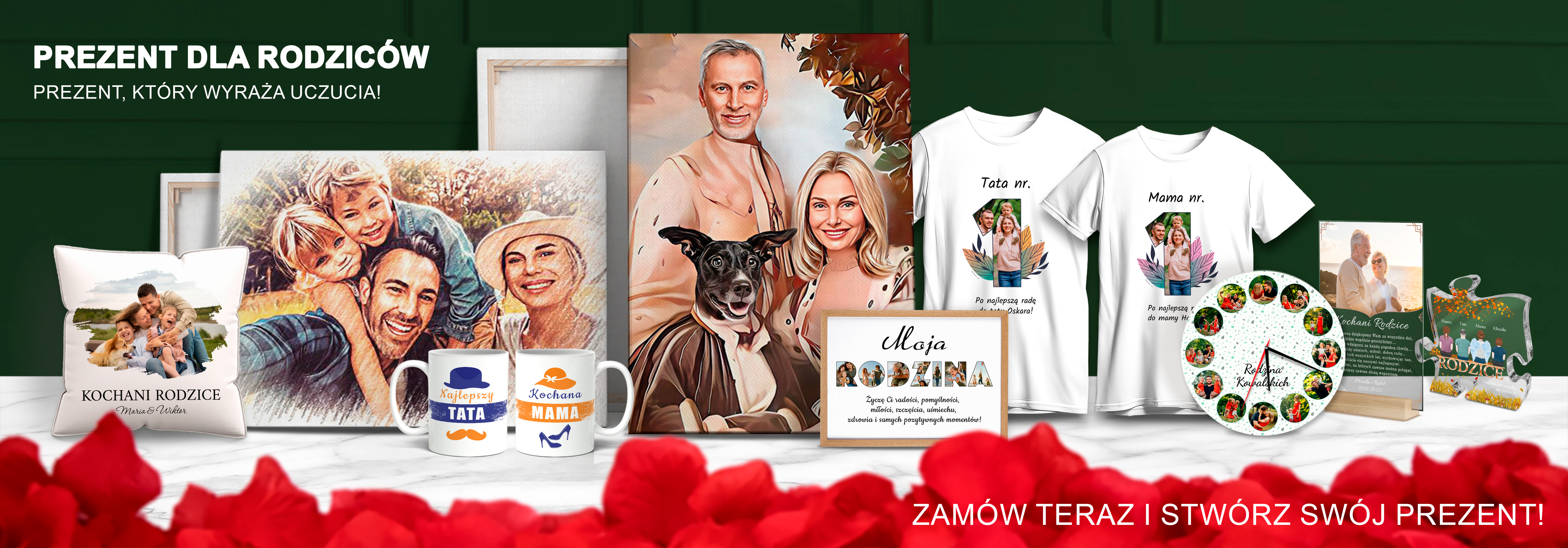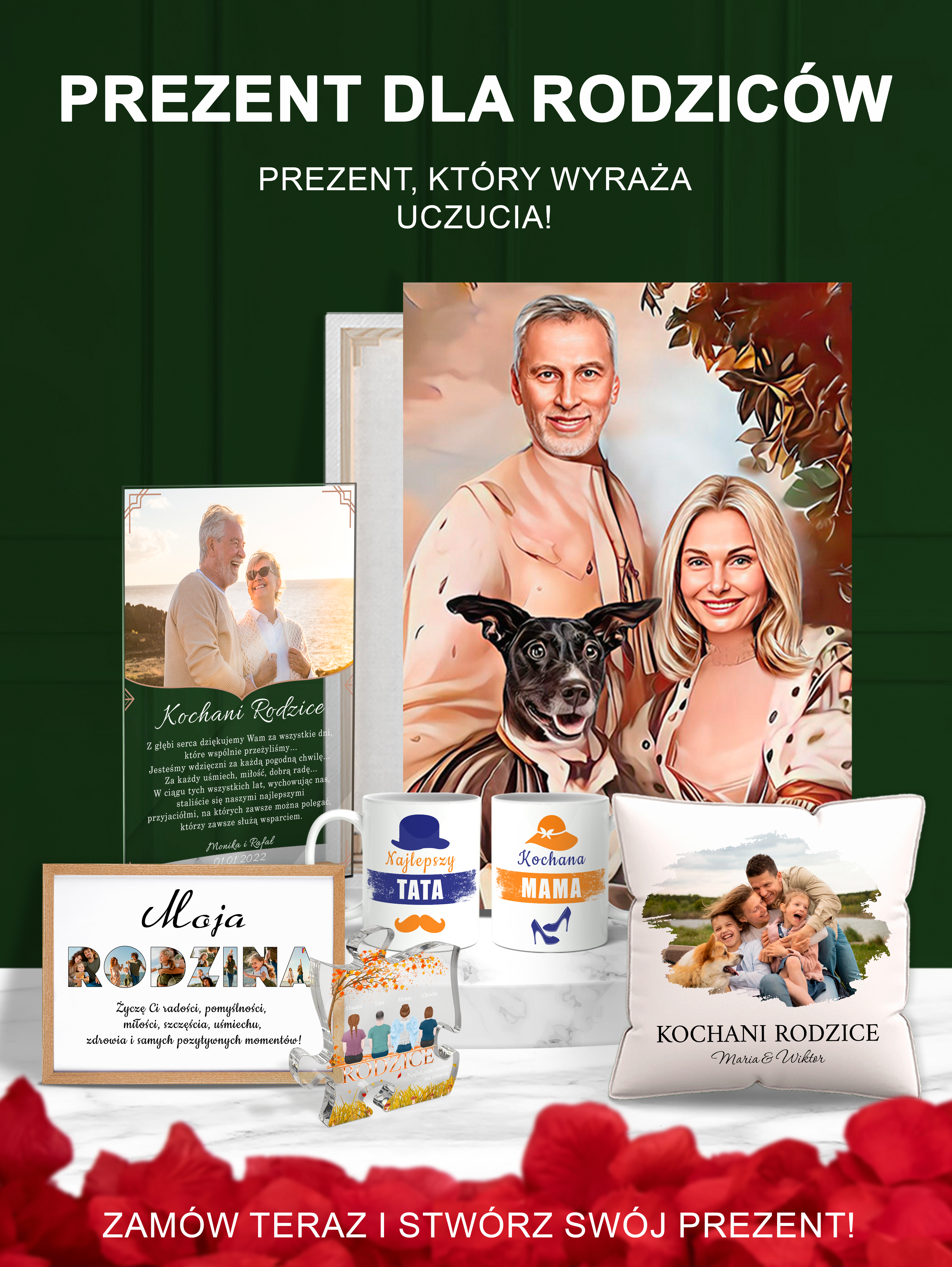 Każdy prezent dla rodziców na święta możemy elegancko zapakować. Wybierz opcję przy składaniu zamówienia, a nasz zespół przygotuje paczkę tak, by była gotowa do wręczenia. W naszym sklepie możesz spersonalizować wszystko – od szkieł, obrazów i dekoracji, przez odzież i tekstylia. Drukujemy zdjęcia na płótnie i ceramice. Mamy również wieczne róże, ukryte pod przezroczystą kopułą. Znajdziesz je solo, a także w praktycznych zestawach prezentowych. Prezent dla rodziców od dzieci w postaci pasujących do siebie koszulek czy bluz z pewnością wywoła uśmiech. Sprawdź nasz pełny asortyment!