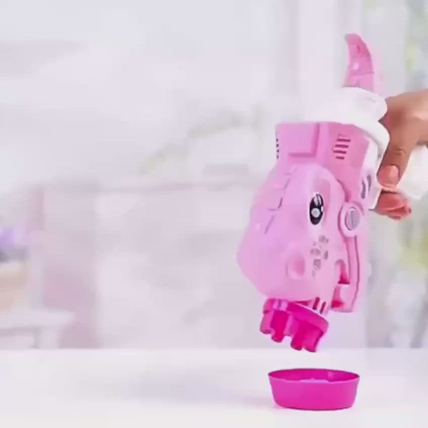 Pistolet do bąbelków jest łatwy w użyciu, wlej płyn do bąbelków na tacę, a następnie pociągnij za spust i naciśnij przełącznik, aby wygenerować bąbelki.