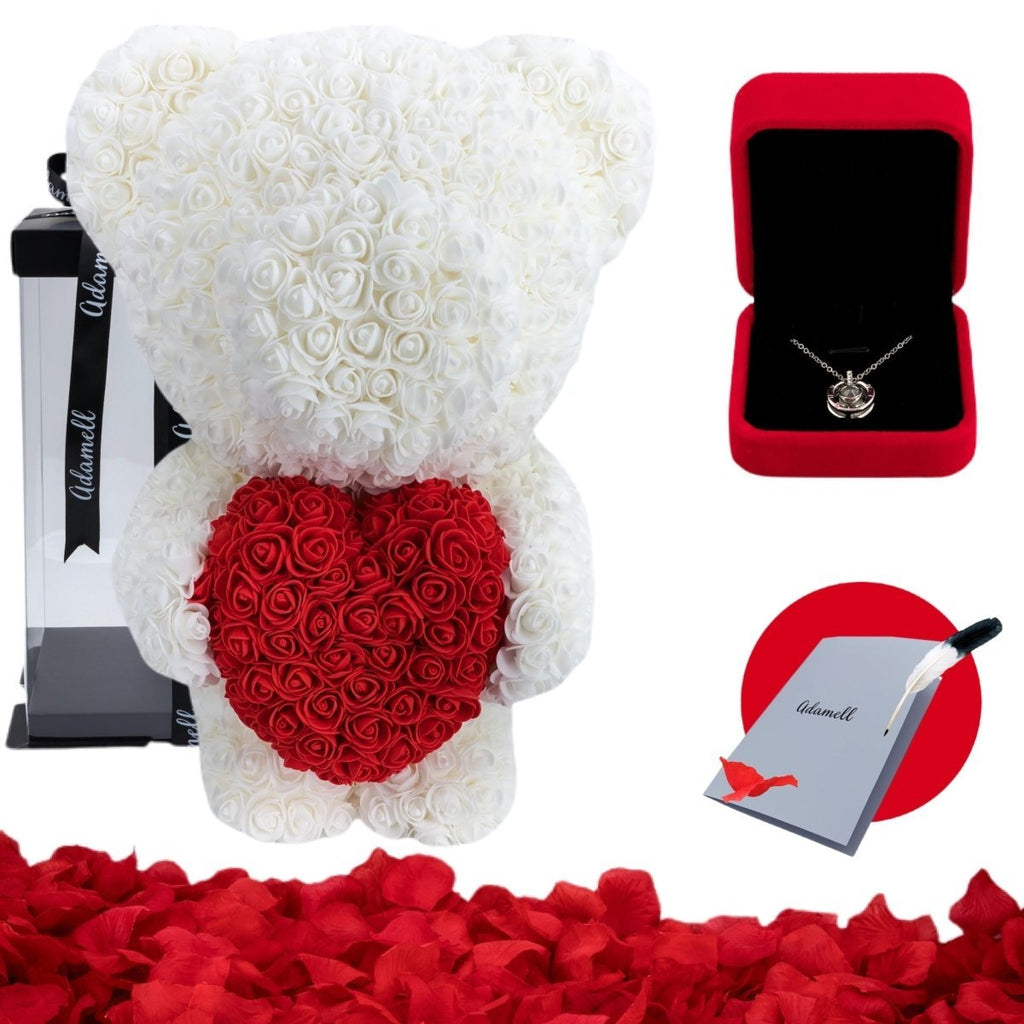 Miś z róż | Biały z sercem 60cm, Upominek na dzień kobiet, na 20 rocznicę, na gwiazdkę, wspólny prezent, na bierzmowanie, dla wychowawcy, pielęgniarki