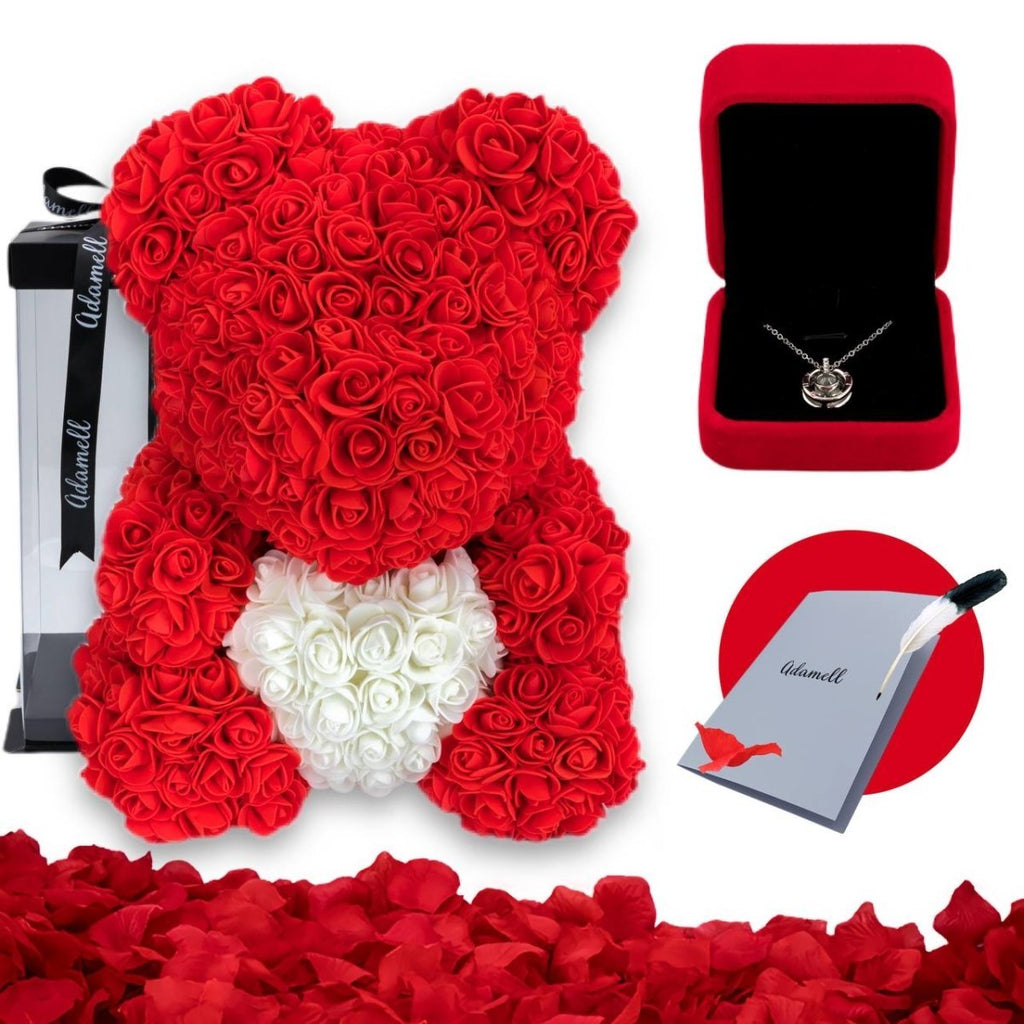 Miś z róż | Czerwony z sercem 40cm, ZESTAW, Idealny pomysł na prezent dla dziewczyny, przyjaciółki, kobiety, najlepsze na walentynki, na 18 urodziny