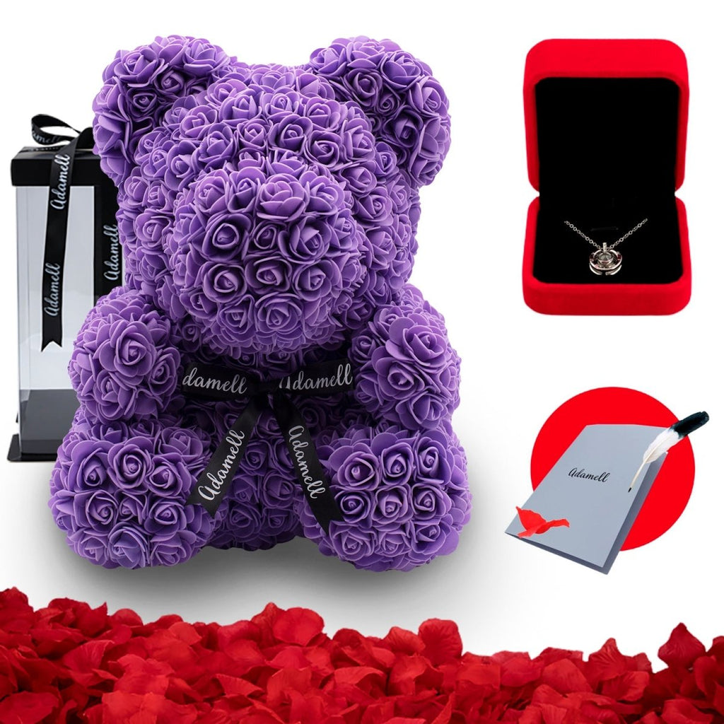 Trwałość. Różany miś nie jest jednorazowym elementem dekoracyjnym. Cały prezent, łącznie z opakowaniem, jest dobrze wykonany i niezawodny oraz zaprojektowany z myślą o długim okresie użytkowania. Nasz miś różany wykonany jest ze sztucznych kwiatów i nie wymaga dużej pielęgnacji. Pozostaje piękny i zachwyca rok po roku.