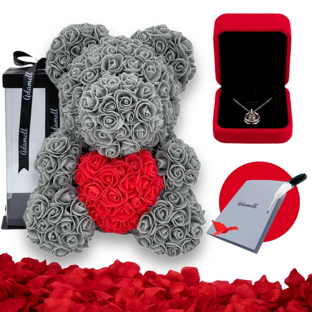 Miś z róż | Szary z sercem 40 cm, Wzruszający, Nietypowy, uniwersalny prezent dla rodziny, kuzynki, podziękowanie, psychologa, weterynarza, krawcowej